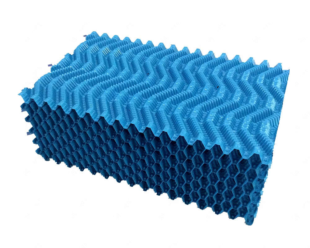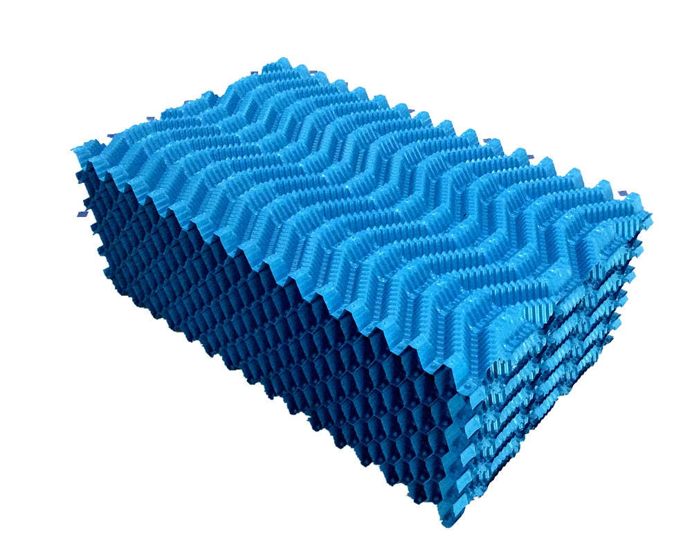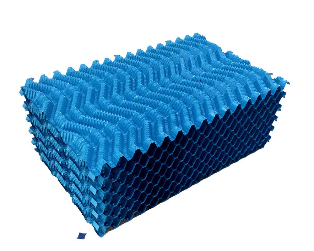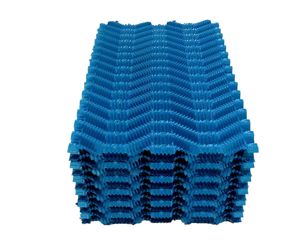冷卻塔塔芯填料是由優(yōu)質(zhì)PVC聚乙烯片正負壓及吸塑而成,主要采用了水紋波形、梯形波、點波形、S波型、人字波形填料,散熱面積增長系數(shù)大,水流在板面上分布性能好,水和空氣流經(jīng)板面時擾動大等優(yōu)點。填料不易變形,耐高溫,抗老化,且阻燃性能好,風阻系數(shù)小。安裝方便,易清洗,運輸方便該散熱填料采用粘接式及懸掛式,安裝簡便,便于清洗,且成功解決了粘接填料因吸積垢、自重而產(chǎn)生變形,且變形后積垢更加嚴重、難于清洗的問題。填料阻燃性能好,阻燃氧指數(shù)指標為42.7,每立方米組裝體質(zhì)量約為15 kg—30kg/m3,組裝高度為0.5m—3.0m,交錯布置,對于塔壁周邊異形塊可視現(xiàn)場布置情況,按實際尺寸切割、安裝。