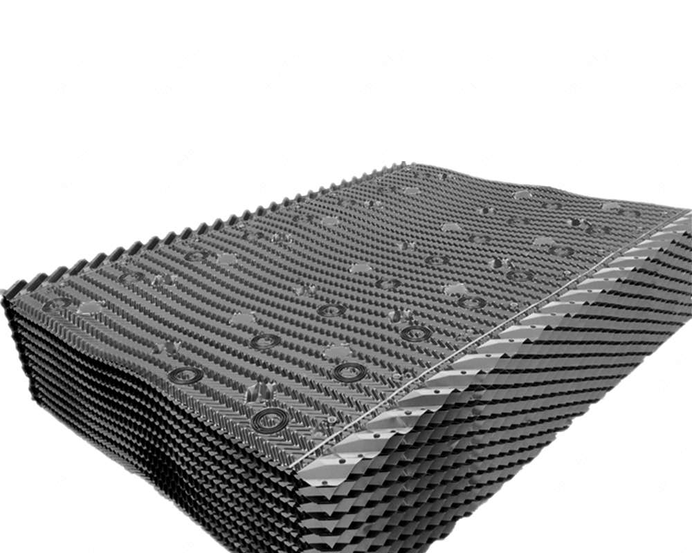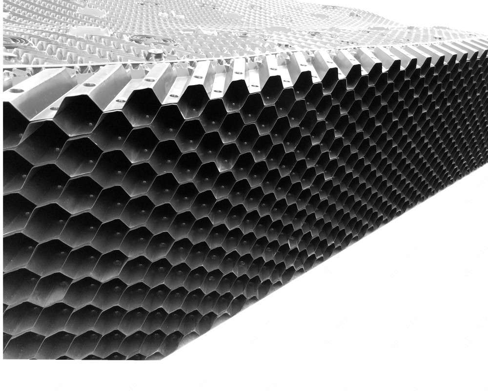 冷卻塔塔芯填料是由優(yōu)質(zhì)PVC聚乙烯片正負(fù)壓及吸塑而成,主要采用了水紋波形、梯形波、點(diǎn)波形、S波型、人字波形填料,散熱面積增長(zhǎng)系數(shù)大,水流在板面上分布性能好,水和空氣流經(jīng)板面時(shí)擾動(dòng)大等優(yōu)點(diǎn)。填料不易變形,耐高溫,抗老化,且阻燃性能好,風(fēng)阻系數(shù)小。安裝方便,易清洗,運(yùn)輸方便該散熱填料采用粘接式及懸掛式,安裝簡(jiǎn)便,便于清洗,且成功解決了粘接填料因吸積垢、自重而產(chǎn)生變形,且變形后積垢更加嚴(yán)重、難于清洗的問題。填料阻燃性能好,阻燃氧指數(shù)指標(biāo)為42.7,每立方米組裝體質(zhì)量約為15 kg—30kg/m3,組裝高度為0.5m—3.0m,交錯(cuò)布置,對(duì)于塔壁周邊異形塊可視現(xiàn)場(chǎng)布置情況,按實(shí)際尺寸切割、安裝。